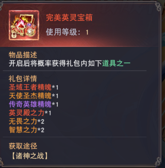 完美英灵宝箱:可开出圣域王者精魄、天使圣杰精魄、传奇英雄精魄等。