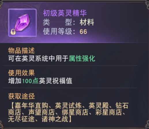 初级英灵精华:用于提升英灵祝福值,每个增加100点。