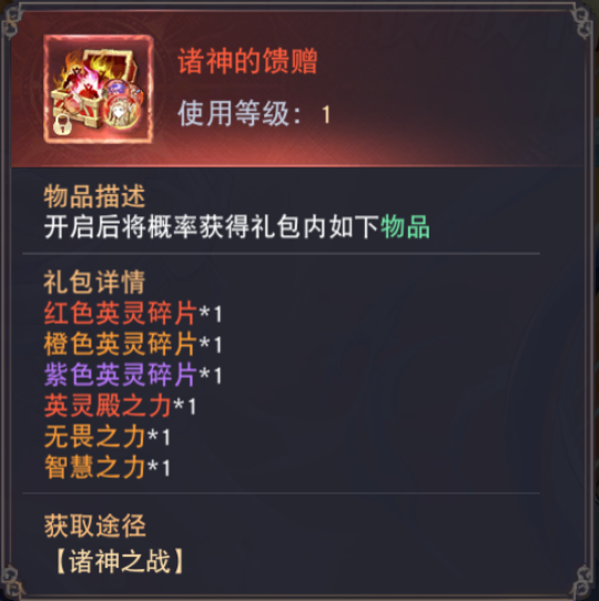诸神的馈赠:内含红橙紫英灵碎片、无畏之力、智慧之力等极品奖励。