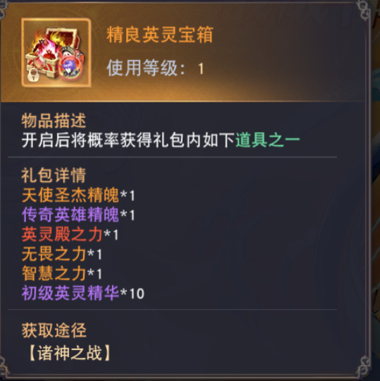 精良英灵宝箱:可获得天使圣杰精魄、英灵殿之力、智慧之力等资源。