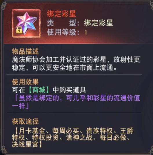 | 绑定彩星 | 特殊货币 | 绑定版彩星,可购买道具 | 月卡基金、诸神之战等 |