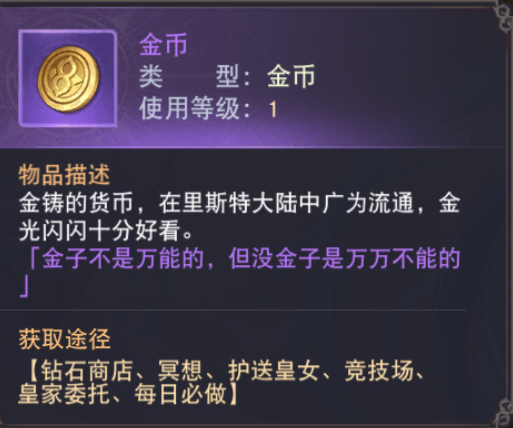 | 金币 | 通用货币 | 各类系统使用 | 钻石商店、冥想、护送皇女等 |