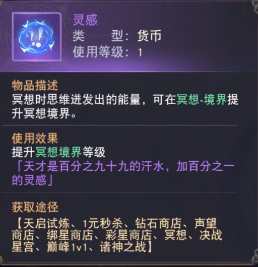 | 灵感 | 冥想货币 | 提升冥想境界 | 天启试炼、诸神之战等 |