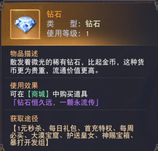 | 钻石 | 高级货币 | 商城购买道具 | 每日礼包、首充特权、护送皇女等 |