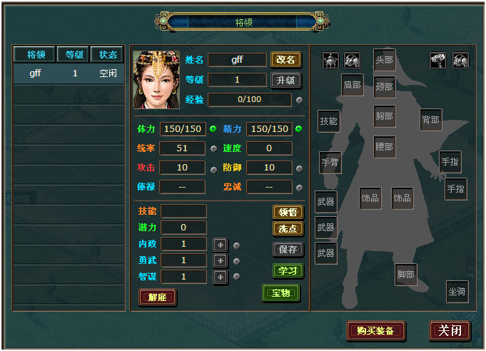| 小娘子 | 50 | 1 | 1 | 1 | 君主将每升一级多3点可分配潜力点,潜力无法对统帅进行分配。 |