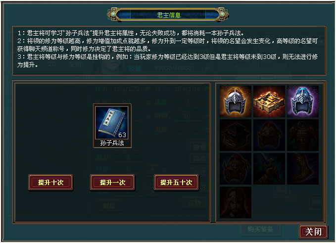 君主将可通过学习"孙子兵法"来提升自身修为等级,无论提升是否成功都会消耗一本。此道具可批量使用。