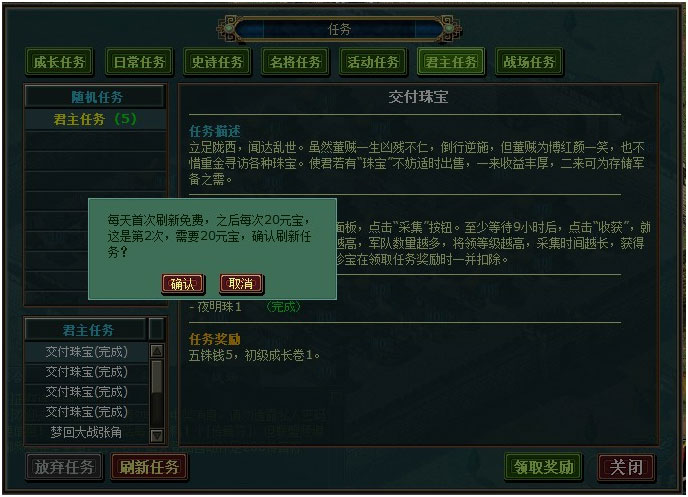 任务刷新:原则,每刷新一次消耗20元宝。刷新无次数限制。君主任务刷新后,直接出现在玩家任务列表的君主任务一栏。