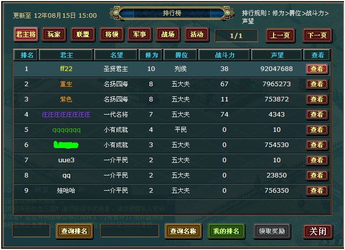 2) 君主将排行榜排行规则采取以下方式:修为〉爵位〉战斗力〉声望〉