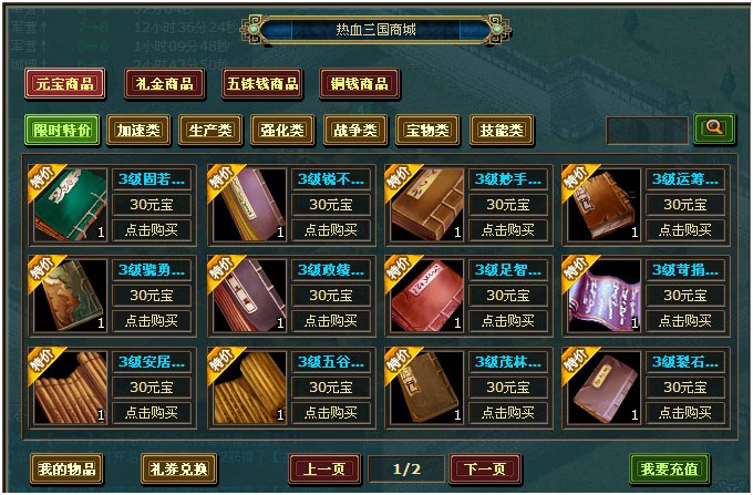 1) 区分宝物分类,不同货币销售不同商品。例如:同样的物品元宝商品只能使用元宝购买,无法使用礼金购买。划分为五块大的区域(元宝、礼金、五铢钱、铜币、战场)