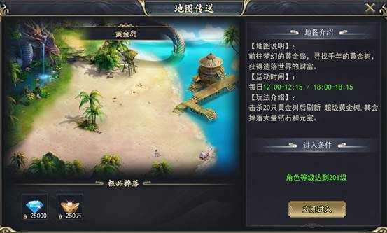 玩法介绍:击杀20只黄金树后刷新 超级黄金树,其会掉落大量钻石和元宝。