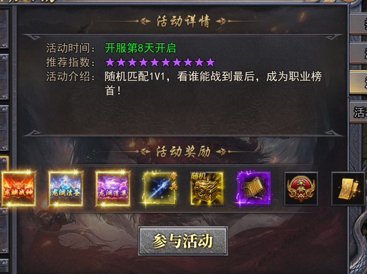 开服第8天震撼开启!请所有勇士务必提前磨砺刀剑,将状态调整至巅峰!这是一场不容错过的巅峰对决!