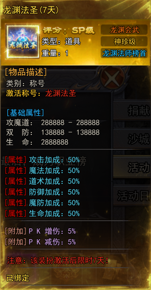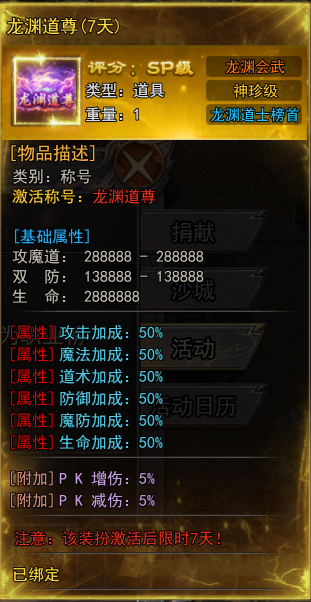 更逆天的是它们高达50%的全属性加成(攻击、魔法、道术、防御、魔防、生命全方位提升),以及5%的PK增伤与5%的PK减伤!虽然限时7天,但在这7天内,你就是全服同职业中不可撼动的绝对真神!