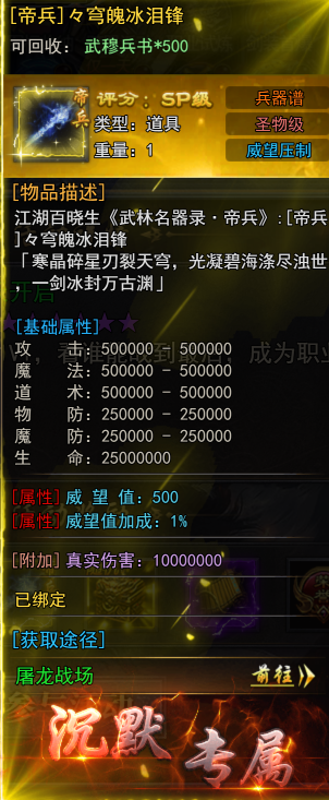 基础攻魔道高达50万,双防25万,生命值狂加2500万!附加1000万的真实伤害与威望值压制!手握帝兵,一刀破天,万军臣服!
