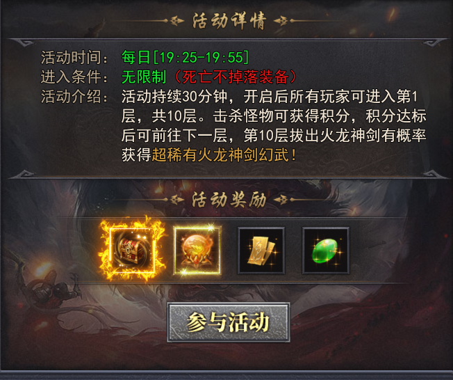 零门槛,无限制!所有人皆可参与!更让人疯狂的是,活动场景内死亡绝对不掉落装备!