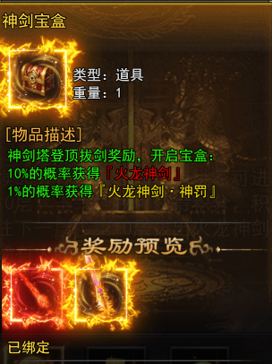 开启宝盒,心跳加速的时刻到来:你将有 10% 的超高概率直接获得『火龙神剑』!更有 1% 的极限概率,爆出传说中的至臻神器「火龙神剑·神罚」!一旦拥有,你就是全服最耀眼的杀神!