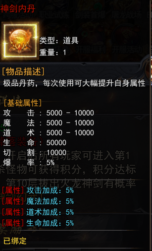 每次使用,你的属性将迎来爆炸式增长!基础攻魔道直接飙升5000-10000,生命值狂加50000!更恐怖的是它带来的百分比加成:攻击、魔法、道术、生命全部提升5%!吞下它,让你的战力突破极限!