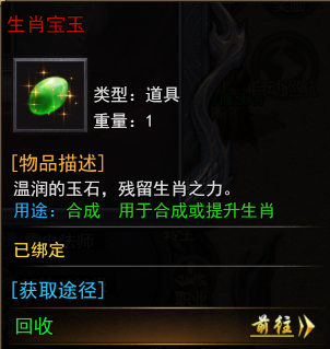温润的玉石中,残留着强大的生肖之力!在闯塔过程中获得的生肖宝玉,是合成与提升极品生肖装备的必备核心材料!收集它们,打造属于你的无敌生肖套装!