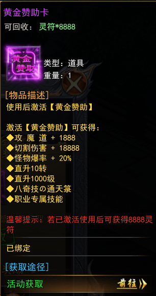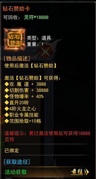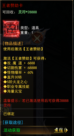 激活王者赞助,攻魔道暴涨6888,切割伤害增加68888,怪物爆率直接提升60%!更有5阶火龙之心与直升30转的逆天特权!白嫖当大佬,就是这么简单!
