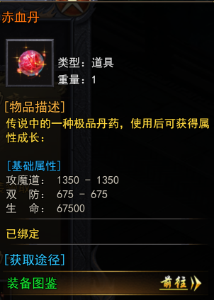 • 赤血丹: 终极神药!使用后攻魔道直接飙升1350,生命值狂加67500!吞下它,你的战力将突破极限!