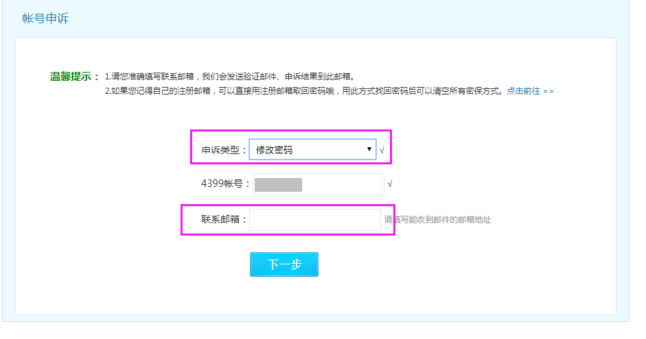 (1)按照要求填写对应的申诉原因、4399账号、联系邮箱