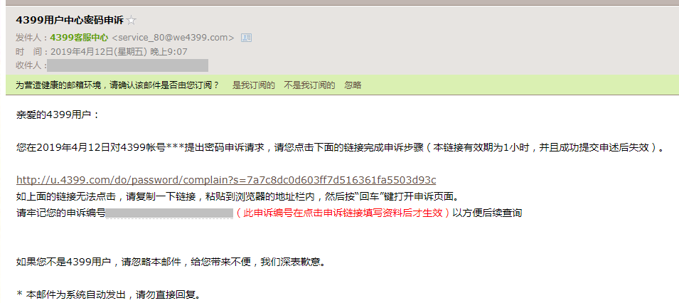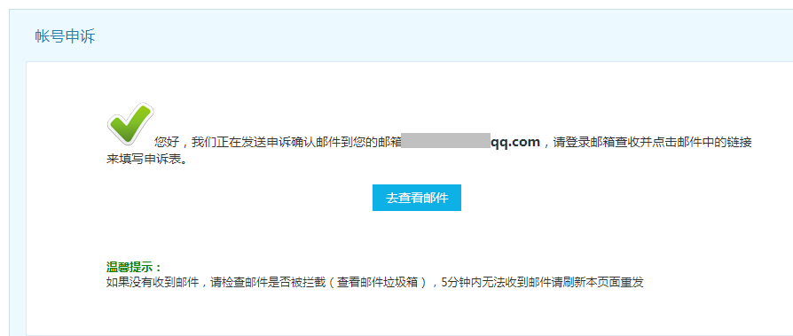 注:由于是系统邮件,可能会被邮箱误判为垃圾邮件,如果在收件箱无法看到申诉邮件,可以在邮箱的垃圾箱目录找一下看看