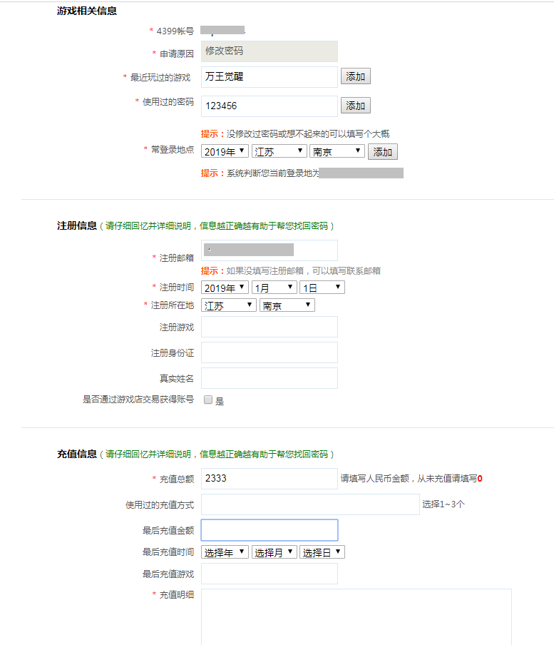 ②如果充值过,请详细填写充值信息!!!