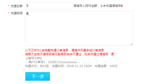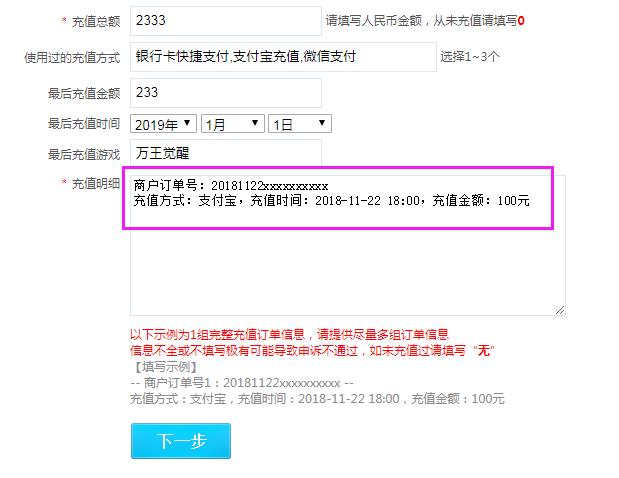 充值明细:填写好订单号和对应的充值时间、金额,如果充值笔数较多,请填写大额的充值,比如单笔328元以上的订单。
