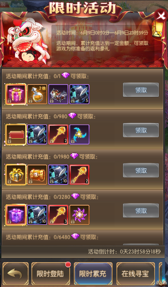 活动简介:活动期间,累计充值达到一定金额,可领取游戏为你准备的返利豪礼