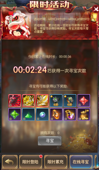 活动简介:活动期间,累计在线一定时常可获得寻宝次数,寻宝可获得珍稀奖励。寻宝次数每天零点重置。