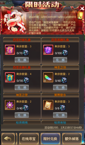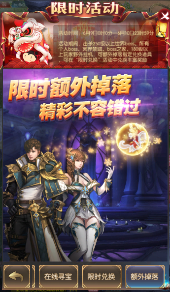活动简介:活动期间,击杀250级以上世界boss、所有个人boss、冥界禁域、boss之家可额外掉落指定兑换道具,可在“限时兑换”活动中兑换丰富奖励;180级以上玩家野外挂机可额外掉落指定兑换道具,可在“限时兑换”活动中兑换丰富奖励