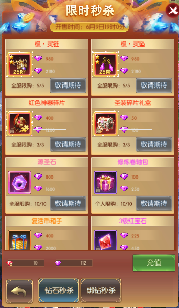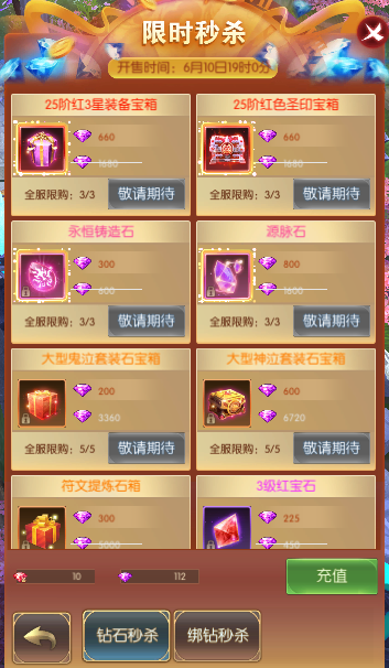 活动简介:活动期间,玩家能以超低的价格秒杀原价道具,机会不容错过。