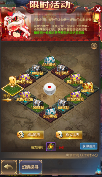 3.投骰子需要消耗幻境探寻道具。幻境探寻道具会通过钻石商城购买、累充和限时兑换获得。