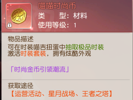 物品描述: 可在“时装喵吉扭蛋”中抽取极品时装,激活时装套装,获得炫酷外观。