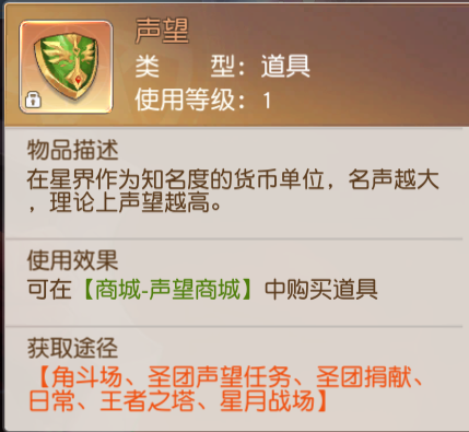 使用效果: 可在【商城 - 声望商城】中购买稀有道具。