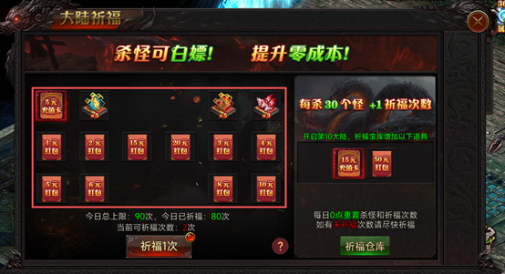 每杀30个怪物即可祈福1次,大陆等级越高获得的红包和充值卡的额度就越高,每天重置天天祈福天天领红包和充值卡。