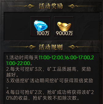 4.每日可抢矿2次,抢矿成功将获得该矿20%的收益,抢矿失败不扣除次数。
