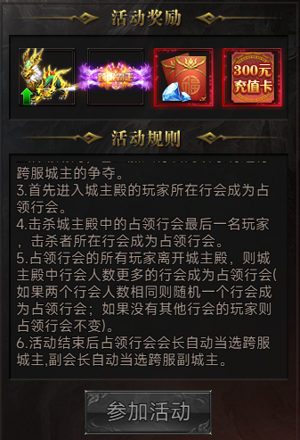 2.活动期间,已经加入行会的玩家将进行跨服城主的争夺。